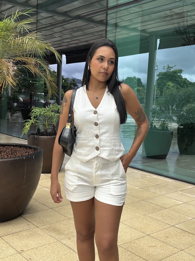 Modelo vestindo Short e colete tamanho M. Encontre a calça Lima e o short Viena também em nosso site!